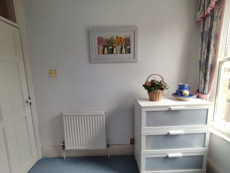 A bright and airy single room located on the first floor of a well maintained Victorian house, with a shared bathroom next door, large desk and chests of drawers, built-in mirror wardrobe & plenty of storage, comfortable bed, book shelves, overlooking a beautiful patio garden. You will share the facilities in the house with the owner couple. You will have access to a fully equipped modern kitchen (with washer/dryer, microwave, fridge/freezers, and a range of cooking utensils & crockery), dining room (with a TV), bathroom and garden. Full central heating, free super fast wi-fi, all bills included (excluding personal utilities). Non-smoking, quiet, clean and tidy household.