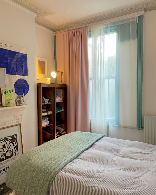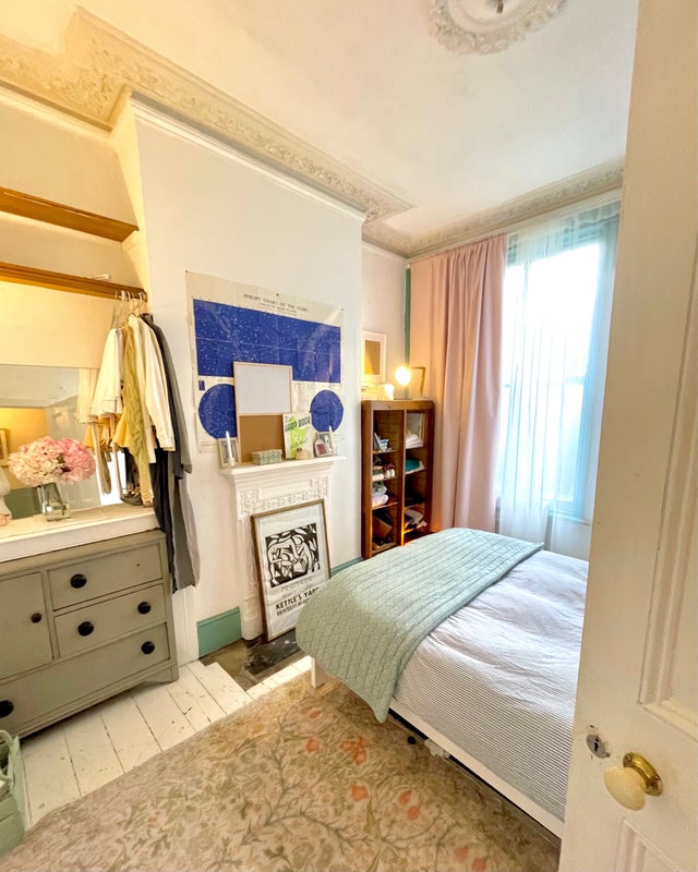Airy, light double room on ground floor or large three-bedroom house on Chatsworth Road. Fireplace and georgian features, with adjoining living area that can be closed off.