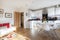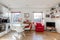 Bright Open-Plan Living Area: A spacious lounge with a fully equipped kitchen, including an oven, washer-dryer, dishwasher, and all essential appliances. Tastefully furnished with a dining table, chairs, a cozy sofa, and a TV, making it perfect for relaxation or entertaining.