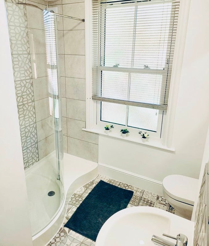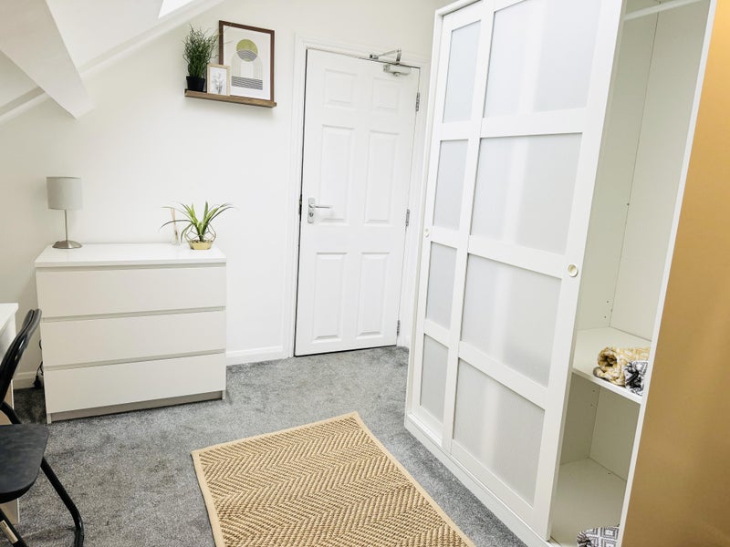 SMART QUIRKY ROOM that comes fully furnished with DOUBLE BED & comfy MATTRESS with mattress protector, LARGE DOUBLE WARDROBE, large chest of DRAWERS, DESK & CHAIR, Bedside Cabinet, rocking chair, TV, lots of STORAGE, your own bedroom door key. HIGH ceilings giving the feeling of SPACE. Room is situated on top floor. 2 x Gorgeous CLEAN bathrooms with high powered showers. You only share 1 bathroom with 2 other professional Tenants!