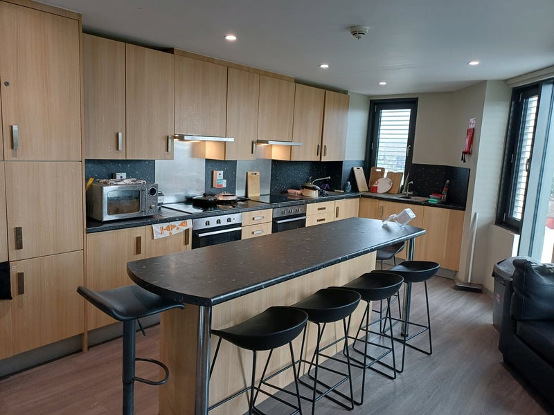 The apartment also includes a clean and modern shared kitchen equipped with: Oven, microwave, fridges, and plenty of storage and cooking space.