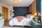 It has five fully furnished bedrooms with wardrobes, beds, desks, and chairs.