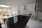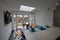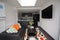 Large open plan kitchen lounge with large skylight and large TV
