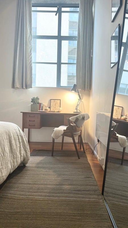 BEDROOM TWO - (11ft/18ft) The available bedroom. Loads of fitted storage, a double bed, a mid century shearling chair and set of draws available for your use