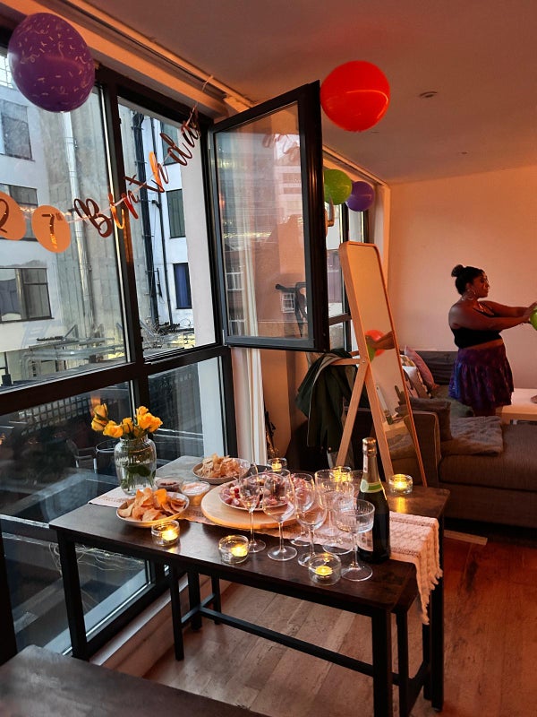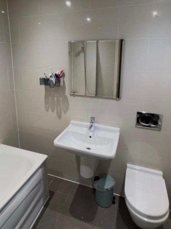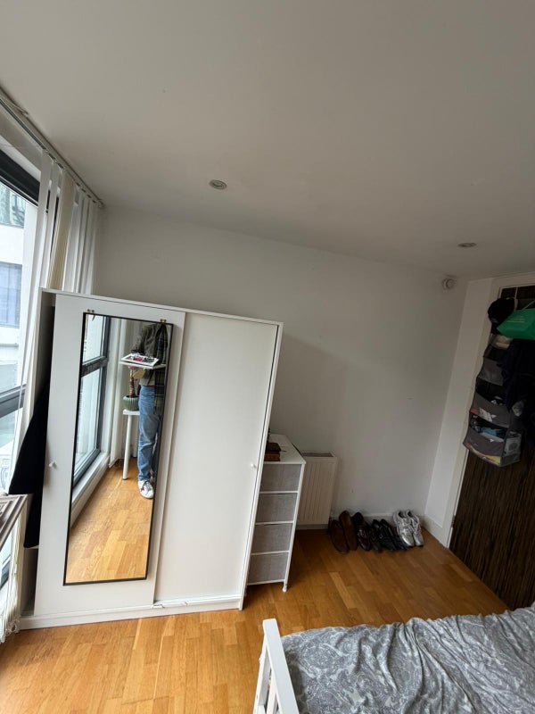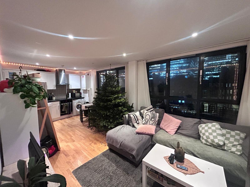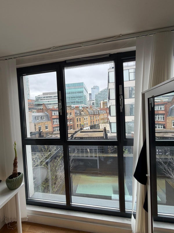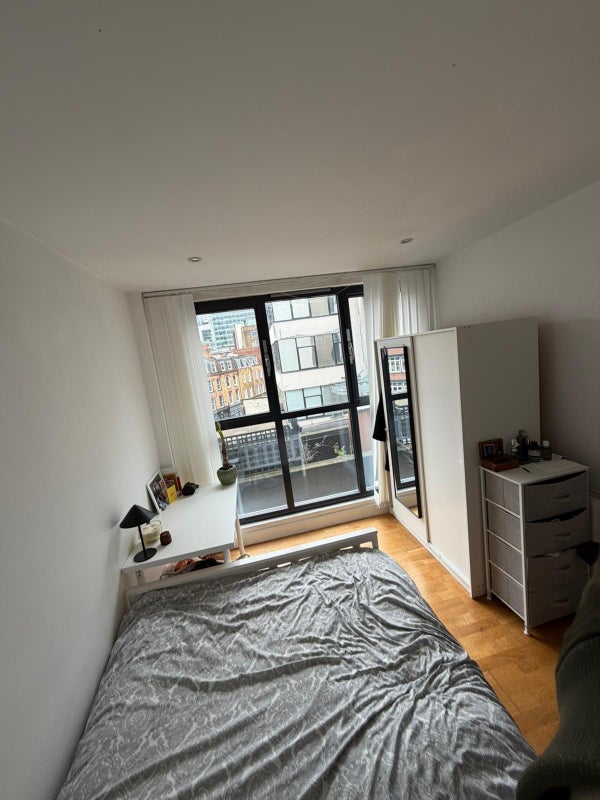 A great room available in a modern flat in the heart of Shoreditch, offering fantastic city views and a comfortable living space.