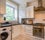 The flat includes a shared living room and a fully equipped kitchen with washing machine. There are two bathrooms (one full bathroom with bath/shower and a separate WC).