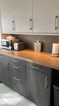 New Kitchen with washing machine, cooker, fridge, microwave, kettle, toaster.