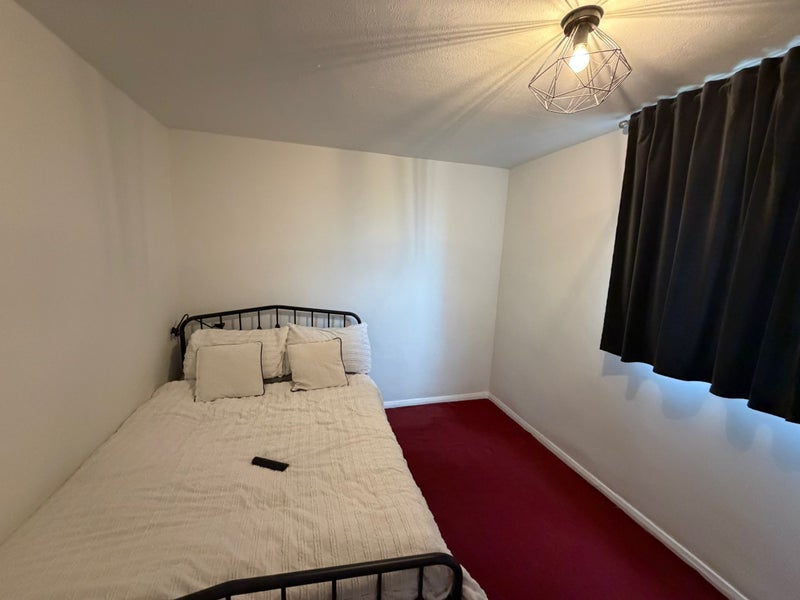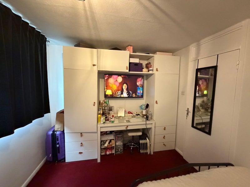 The room is fully furnished and includes a large double bed, built-in desk/workstation, fitted wardrobes, shelving, and a flat-screen TV.