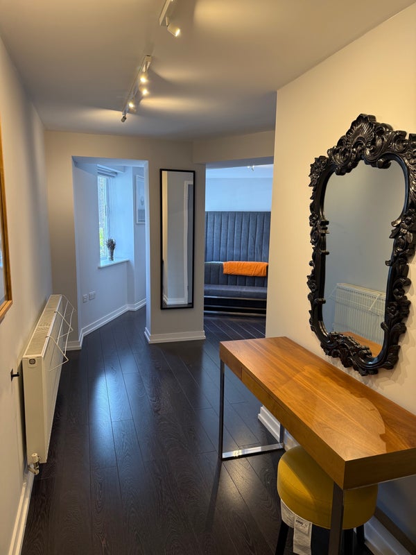 • Dedicated Workspace: A sleek wooden console/desk paired with a feature ornate mirror—ideal for those working from home.