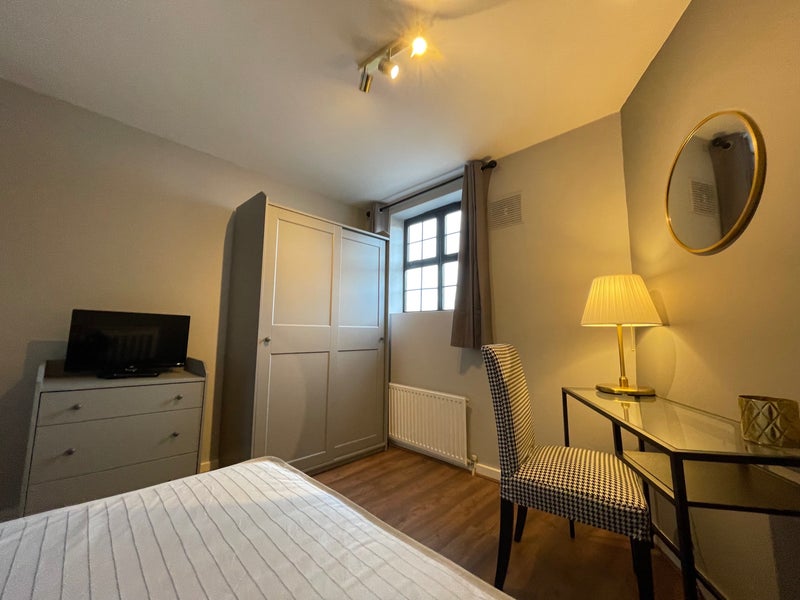 It includes double bed, wardrobe, chest of drawers, desk and chair, mirror, black-out curtains, smart TV.