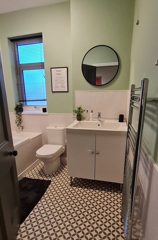 The shared bathroom (first floor) is tastefully finished and includes a shower over bath, WC, and wash basin.