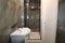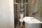En-suite bathroom with shower cubicle, w/c, handbasin with storage cupboard underneath, mirror and heated towel rail.