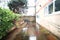 Bathroom with bath, overhead shower, w/c, hand basin and storage cupboard.