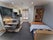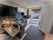 Furnished with bed, chest, shelves, and clothes storage, plus TV and work station with seating.