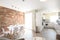 The kitchen is furnished with a dining table and pendant light, microwave, kettle, toaster, Dolce Gusto coffee machine, oven, gas hob, cups, glasses, table wear, cutlery, utensils, tea towels and oven gloves.
