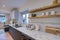 The kitchen is furnished with a breakfast bar and stools, microwave, kettle, toaster, Dolce Gusto coffee machine, oven, gas hob, cups, glasses, tableware, cutlery, utensils, tea towels, and oven gloves.