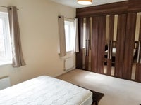 The room larger than normal double bedroom with two windows and ensuite bathroom. It is fully furnished with a double bed and a memory mattress, a 6-door giant built-in wardrobe, a 3-drawer lamp table, a full-size armchair, a floor lamp, a small desk, and shelving/drawer units that provide plenty of storage. There is TV point in the bedroom and the signal to access the BT fibre optic WiFi is strong.