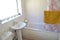 The modern bathroom is a white bathroom suite comprising of a paneled bath, with overhead power-shower, low level pedestal, and wash basin.