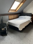 Has Double bed, coffee table and couch, small sink, small fridge, hanging clothes area, smart TV, completely closes down for privacy, house has 2 bathrooms, large kitchen