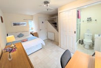 The room forms the top floor of the cottage, with it's own private staircase. It has a window to the front and one to the back of the building.