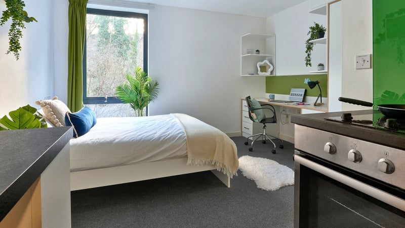 The room is fully furnished with a small double bed, desk, chair, wardrobe, fridge and oven.
