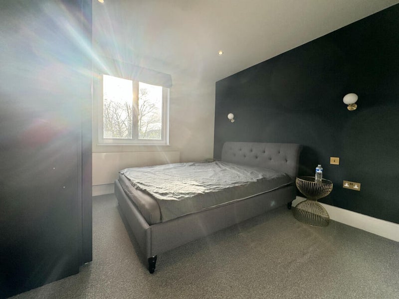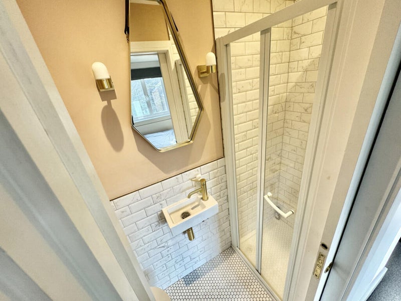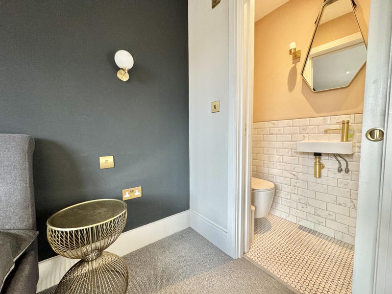 This is the larger double room with its own en suite. It has a grey bed and dark grey/green walls, giving it a calm, stylish feel. Ideal if you value your own space and privacy.
