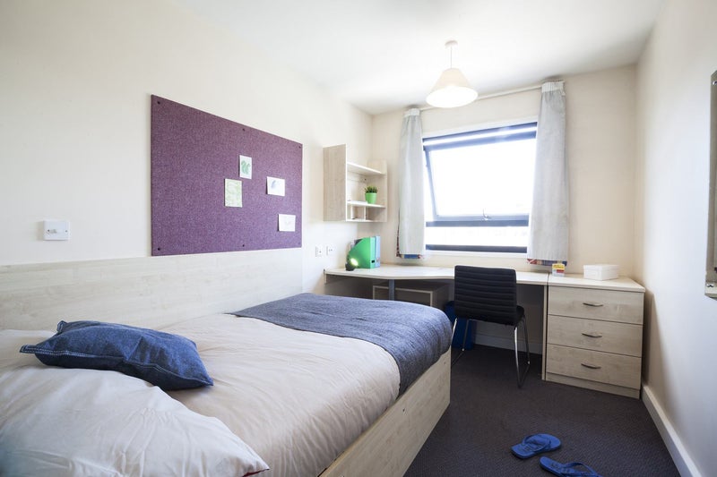 - Furnished (3/4 bed, chair, desk, shelves, wardrobe, curtains, drawers, mirror)