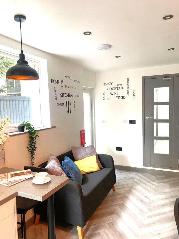 • Open-plan lounge/kitchen with comfy sofas, large TV, dining table – perfect for chilling or working from home.