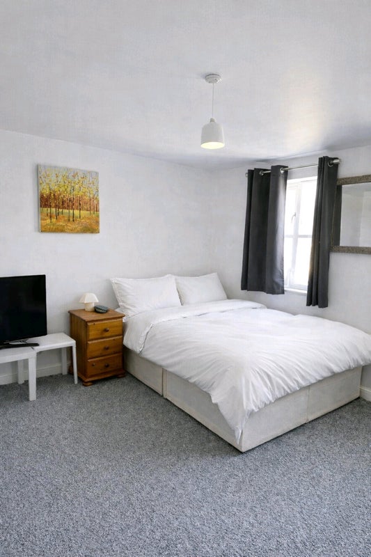 A large double bedroom in a 5-bedroom house split into 3 levels; with 2 bathrooms, a large kitchen/dining area, and a private garden.