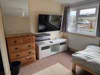 Spacious double room with single bed, bedside cabinet,3 door wardrobe, Chester drawers, tv with remote control, tv unit under tv, desk and swivel chair. Bedroom looks out onto the garden. Shared bathroom/shower sink toilet. Shared kitchen, all kitchen equipment available to use. Downstairs toilet by front door. I’m happy for tenants to relax in my front room if they wish, unless I have company or visitors.