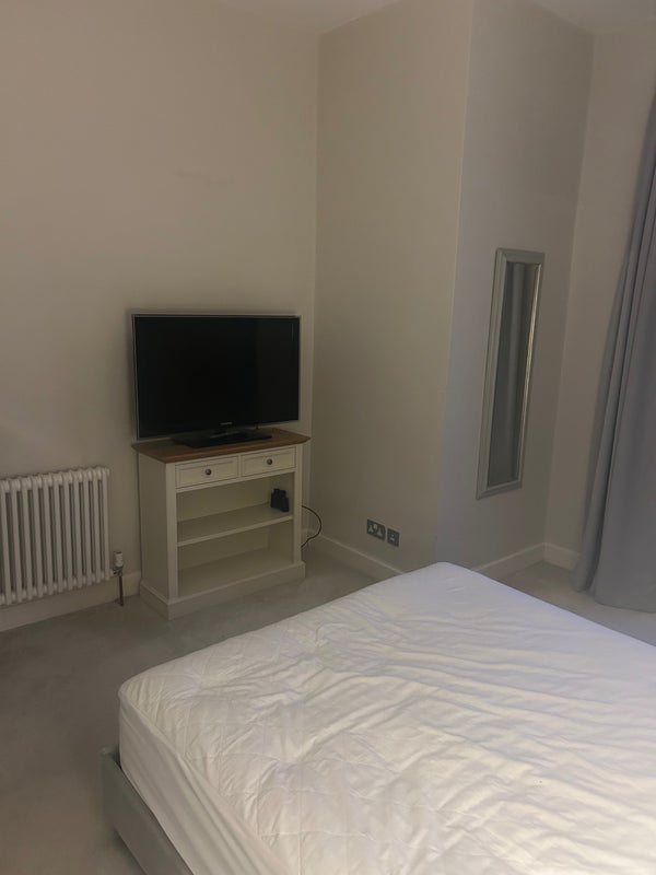 Room available in two bedroom flat, with king size bed, desk, drawers, and small walk-in wardrobe. Flat is fully furnished with everything you’d need. Underfloor heating in the bathroom, which has separate shower and bath.