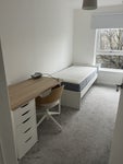 The single bedroom has a built-in closet and a boiler cupboard that can be used for storage, a single bed, and a desk with a chair. It's probably worth noting that the flat is right next to a railway line and the boiler makes some noise when heating. Neither has ever bothered me — the sound insulation is excellent thanks to triple glazing — but just so you're aware! The windows are all south-facing so it does get hot in summer but the upside is the flat is never cold.