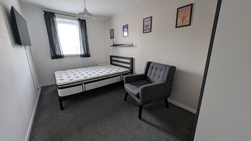 Large size bedroom with double bed, wardrobe, tv and chair. All new. The room has a key door lock. All bills included.