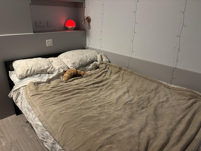 Nice double room with en suite, desk, wardrobe etc in student flat with 4 others (3 girls, 1 guy). The shared kitchen is clean and there are sofas too.