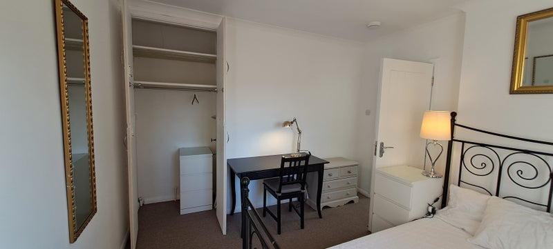 Double bed, writing desk, office chair, chest of drawers and hanging space for clothes.