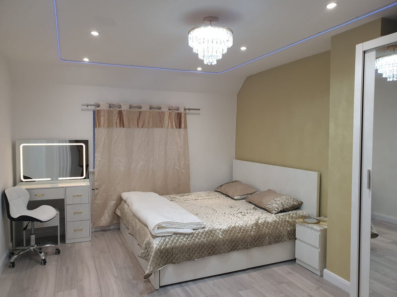 Master room with loads of furniture, large wardrobes, extra storage options. Brand new mattress and bed. Private parking and loads of street parking, quiete and safe erea. Walking distance from park, schools and tram/train, bus stops. 3 min drive to Epsom high street. Massive garden.