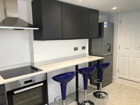 As you enter the property, you are greeted by an entrance hall with the comfy lounge to your right. It is elegantly furnished with two double sofa’s, Smart TV with Free-view and a 4 seater dining table and chairs. The kitchen/diner is a well-equipped contemporary kitchen that also provides plenty of space for tenants personal items, as well as, an electric oven and gas hob, microwave and fridge/freezer. Dine in comfort at the 4-seater breakfast bar. A small utility room houses the washing machine and sink and a separate WC sits just off this. Heading up to the first floor are three of the double bedrooms which each have their own secure lock on the door for privacy, a sink, dressing table and stool. The first of the two bathrooms has a WC, sink and bath with an electric over-head shower and the second has a separate shower, sink and WC. A fifth bedroom is for house-share and provides an area to iron and dry clothes.