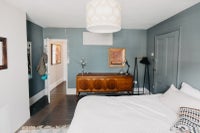 The room has a super king bed that can be unzipped to create 2 single beds, hanging rod, sideboard, and shelves. You'll have a full bath. It's not ensuite but you get your own full bath on the same floor.