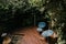 The tiered garden is lush and surrounded by trees with a dining area, and multiple private areas.
