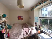There is a bus stop at the top of the road that goes to campus and plenty of on street parking