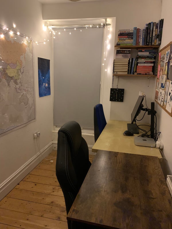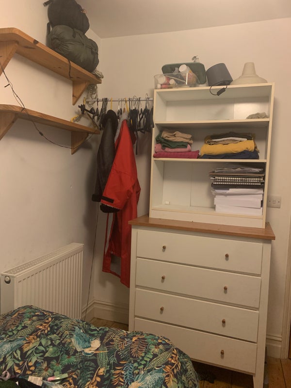 - The rooms: 1 spacious double room with desk, double bed, shelves, wardrobe and chest of drawers. The single bedroom is big for a single, comes with a bed, desk, chest of drawers, clothes rack, and extra shelves. Next to the double bedroom there is also another small room which we have been using as an office (this is a communal room but the other housemates don't really use it)