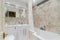 Luxurious bathroom featuring marble-effect tiling and a bath with overhead shower