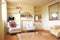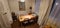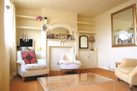 The large east-facing living room/dining room is 5.8 x 3.6m or 19'x12' and is shared. It is furnished with sofa, 3 armchairs, two coffee tables, a dining table and chairs, console table, mirrors and lamps.
