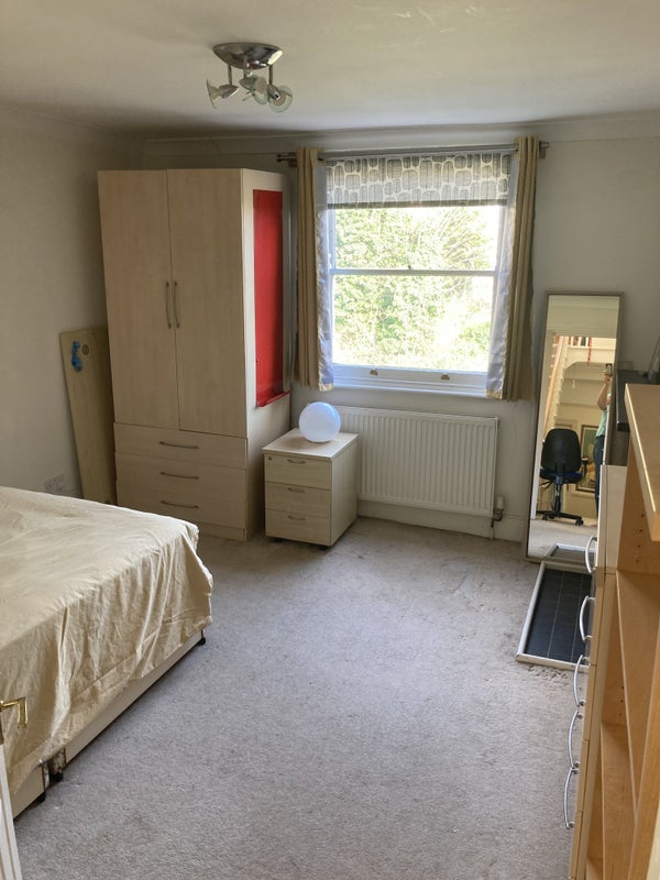 The room looks out onto our large, mature garden. It is furnished with a comfortable double bed, with under-bed storage; and further storage in the form of a hanging wardrobe (with two further drawers) a large chest of drawers and shelving. The desk in the photos is currently in storage, but can be restored to the room if required.