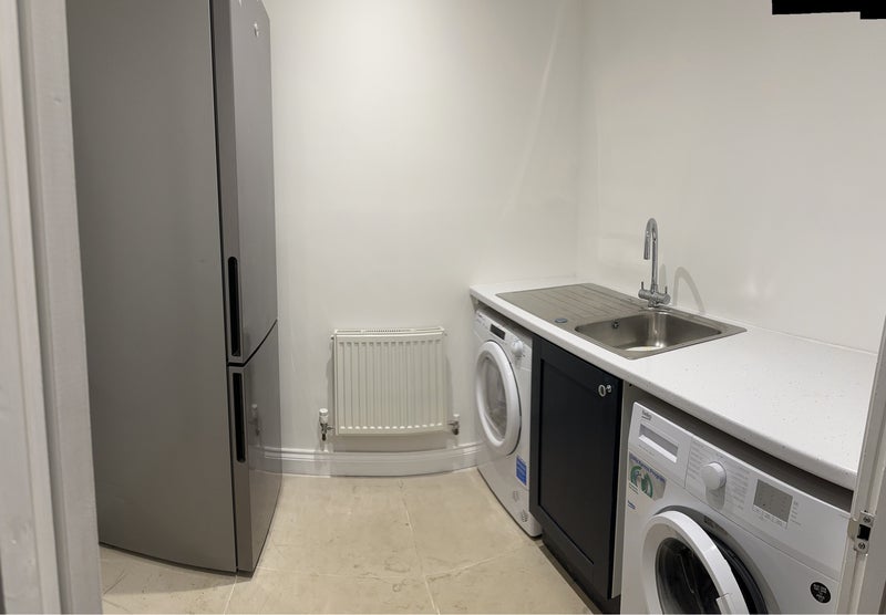 -Dedicated laundry room with washing machine, tumble dryer, sink, and extra-large 2m fridge freezer.