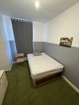 Cozy, compact room featuring a modern grey two-tone wall, comfortable double bed, vintage car art, and green carpeting. Ideal for a simple, quiet lifestyle. Close to saltwell park easy bus to Newcastle and Gateshead city centre.