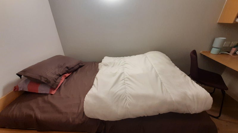 You'll be staying till 29th August 2026 and can renew the contract if still under student status. Small Double Bed with seperate study desk and book racks with a nice view of a bridge from the window. Storage space under the bed and a cupboard. Shared kitchen and living room with a common room in the building that includes a pool tabel, a cinema room and a study room. Car parking and cycle storage also available.