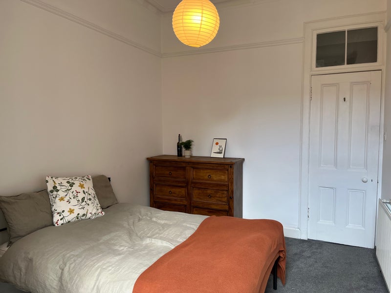 The room is furnished (double bed, wardrobe, large dresser) and overlooks the communal garden.