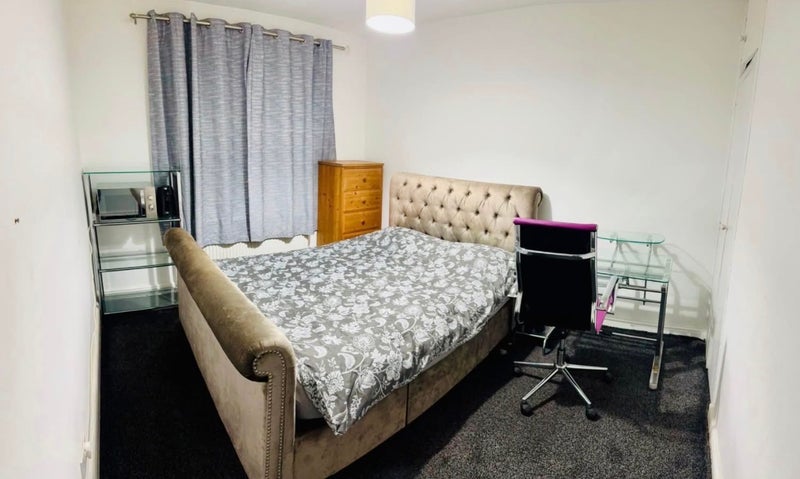 Double room available for rent in a house. King size bed , built in storage closet. Chest of drawer , working space. Free on street parking/driveway parking available . 10 minute drive away from glasgow city centre. Bus stop less than a minute walk away that takes u all the way to city centre and back.