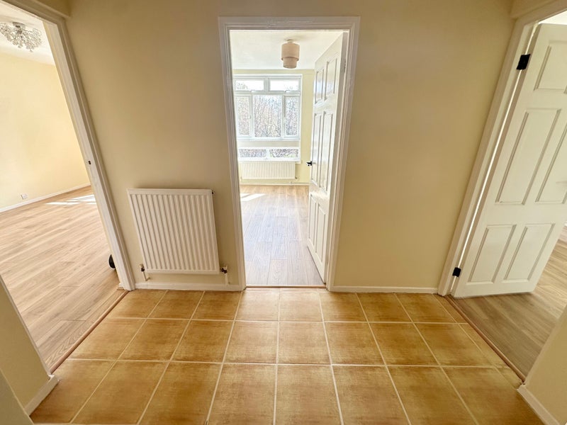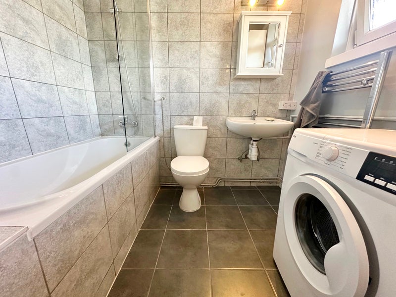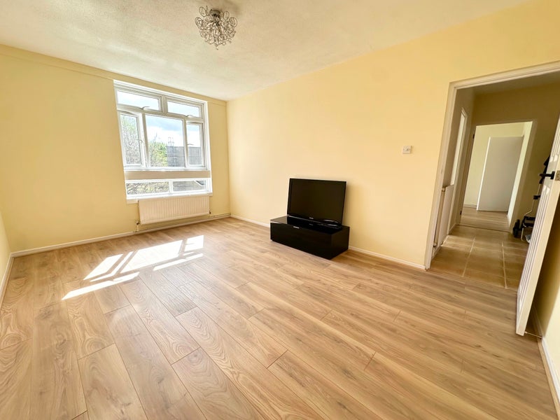 The flat comprises a bright and living room with large windows allowing plenty of natural light, a separate fully fitted kitchen with white appliances and workspace, two generously sized double bedrooms, and a modern bathroom. The property further benefits from neutral décor and laminate flooring throughout, creating a clean and contemporary feel.
